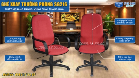 Ghế xoay giá rẻ SG216 thu hút khách hàng ngay từ ánh nhìn đầu tiên với thiết kế vô cùng đẹp mắt và tinh tế. Không chỉ dừng lại với vẻ đẹp bên ngoài, ghế xoay SG216 còn sở hữu vô vàn tính năng ưu việt mang đến cho quý khách những trải nghiệm tuyệt vời nhất: