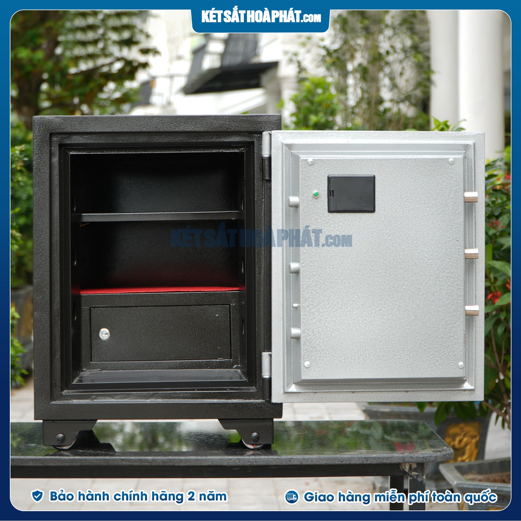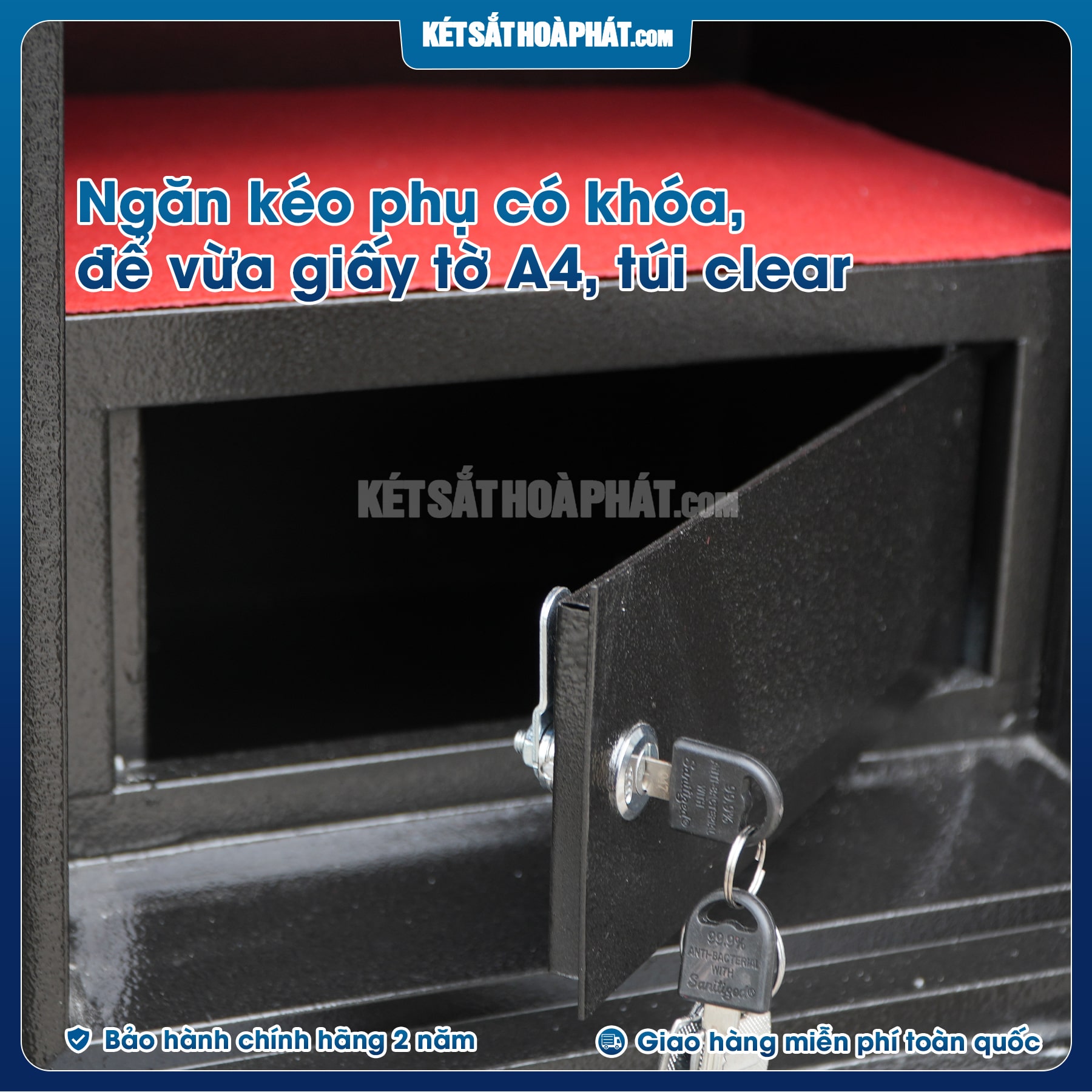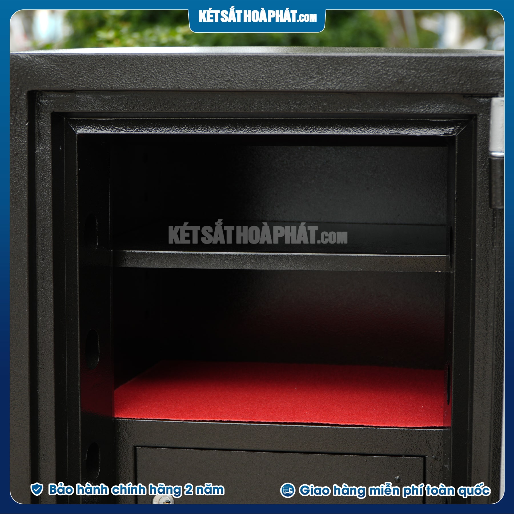- Bên trong lòng két sắt ở phía dưới có 1 ngăn kéo con cao 12cm x rộng 36cm x sâu 26cm. có khóa riêng biệt phía, trên có 1 khay di động có thể nâng hạ được hoặc tháo rời tùy theo ý muốn của mình.