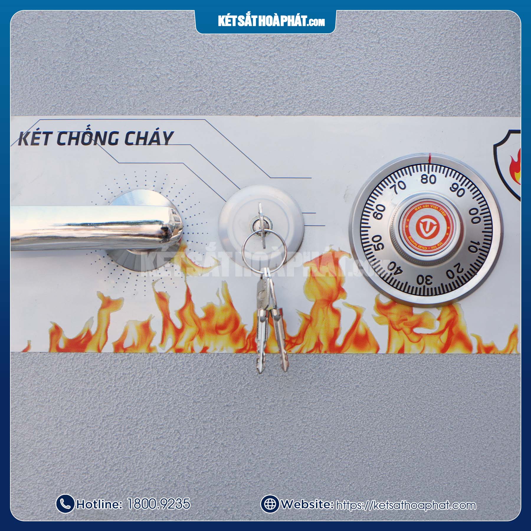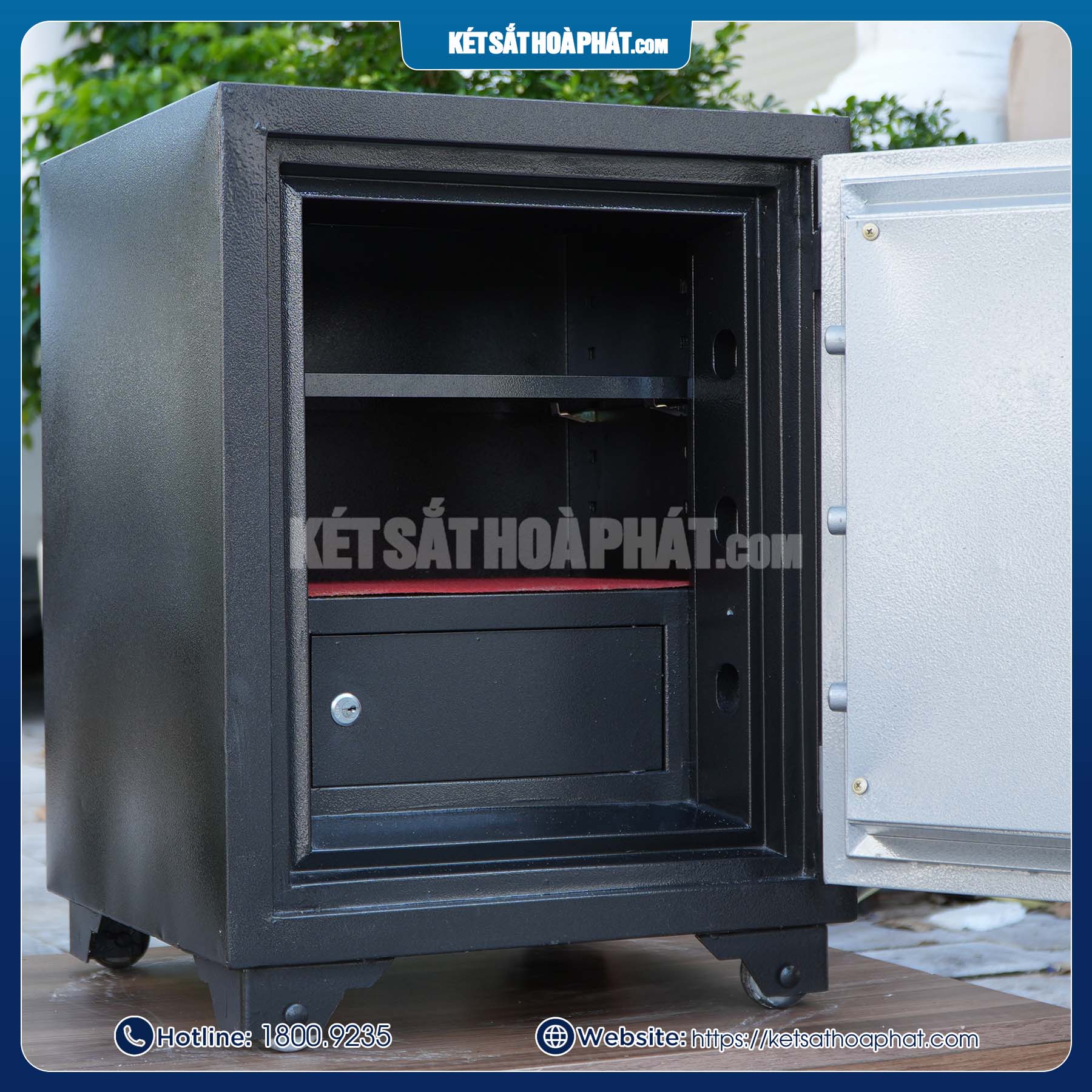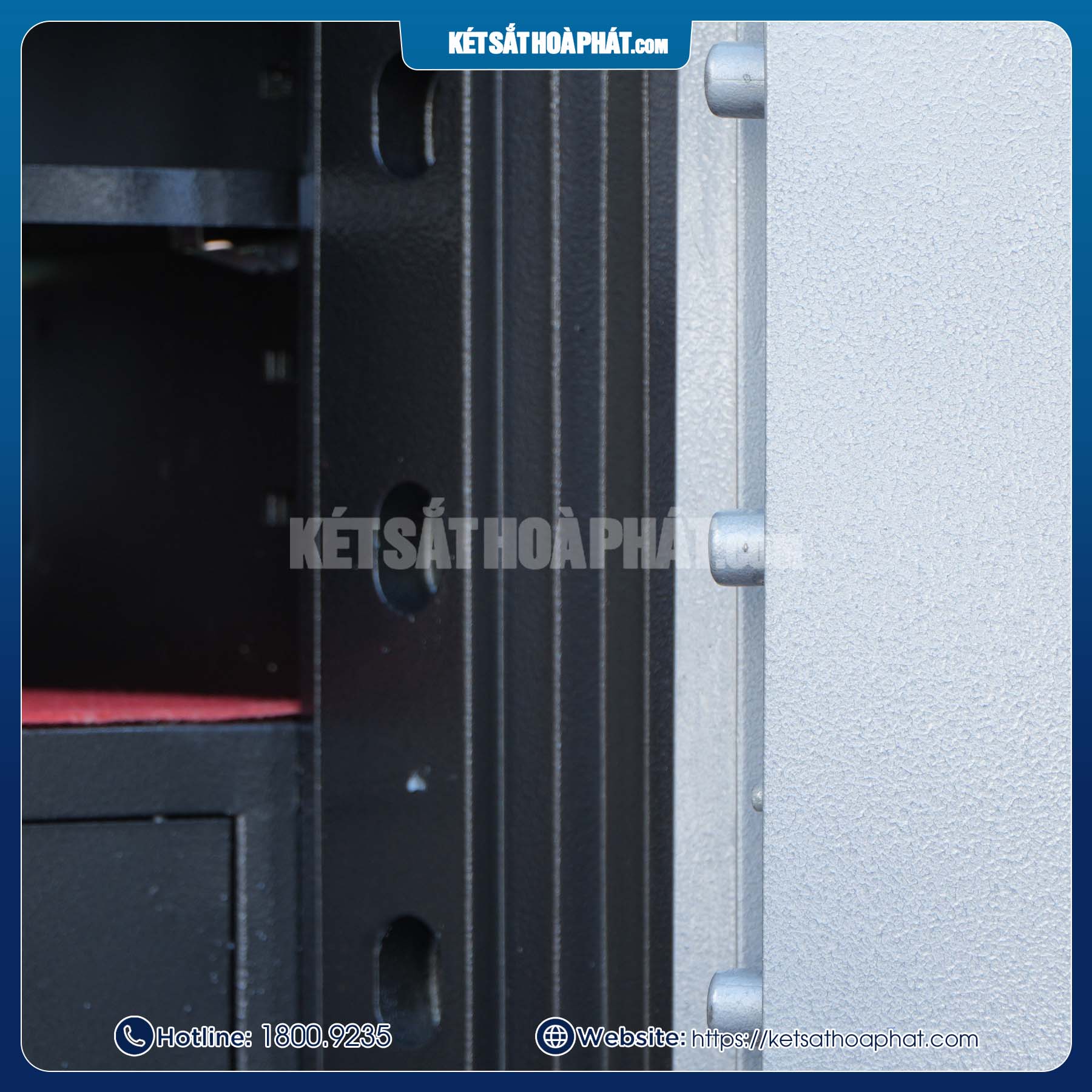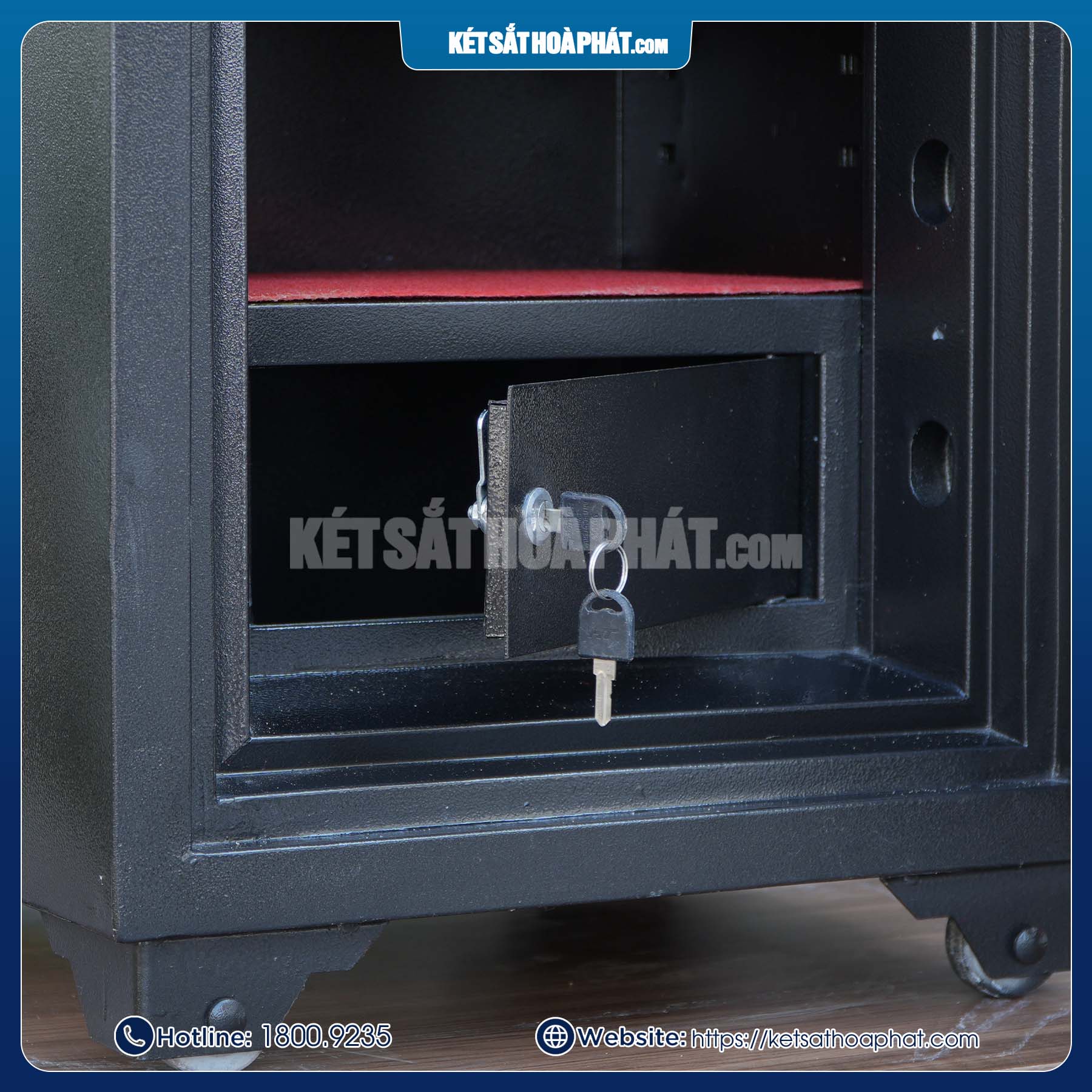 Két sắt có 6 chốt đúc đặc chắc chắn, ăn sâu vào lòng két khi đóng cửa, đảm bảo an toàn trước các hành vi khoan phá, cậy két.