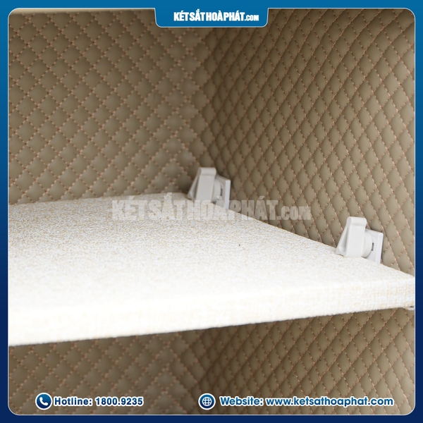 Bên trong két, lớp da bọc cao cấp giúp bảo vệ tài sản quý giá khỏi trầy xước, đồng thời tăng thêm sự sang trọng cho không gian. Ngăn kéo bảo mật có khóa điện tử là giải pháp lý tưởng để lưu trữ các tài sản đặc biệt quan trọng, với không gian rộng rãi, phù hợp để chứa giấy tờ, hồ sơ một cách ngăn nắp.