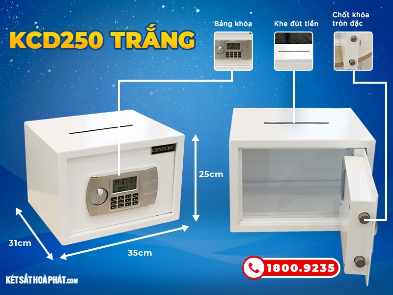 Bạn đang muốn tìm mua một két sắt công đức có độ chắc chắn cao, khả năng chống cháy tốt, chống trộm tuyệt đối,… Két sắt công đức Century khóa điện tử có khe bỏ tiền KCD250 trắng là sự lựa chọn tuyệt vời cho bạn. Liên hệ cho Két sắt Hòa Phát qua Hotline/Zalo: 1800.923 – 0866.895.234 đặt mua sản phẩm với giá tốt nhất nhé!
