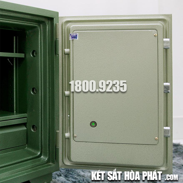 - Két sắt Hòa Phát Cánh Đúc KS125K1DT Chống Cháy cánh mở với 6 chốt chìm đúc đặc Innox phi 15 ăn sâu vào trong lòng két khi đóng cánh cửa lại. Lòng két có 1 đợt di động và 1 ngăn kéo có khóa.