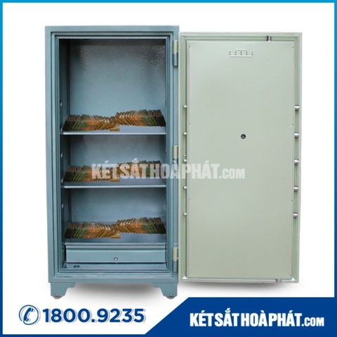 - Két sắt chống cháy Hòa Phát được thiết kế 3 lớp, 2 lớp tôn dày phía ngoài có thể chống cháy ở nhiệt độ cao và một lớp cát cách nhiệt ở giữa.