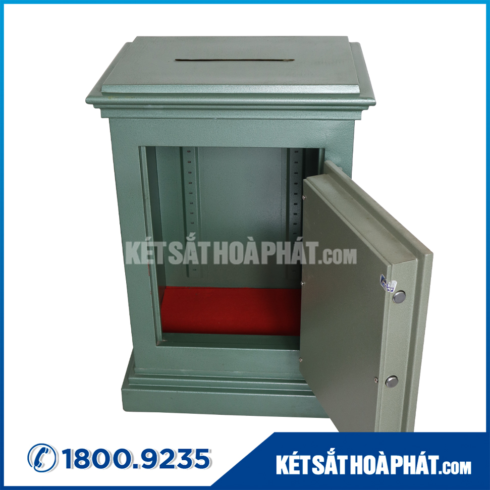 Két sắt công đức khoét nóc KA810 Hòa Phát được thiết kế gọn gàng, cân đối đáp ứng các tiêu chí sử dụng thu ngân hoặc kế toán trong các công ty, doanh nghiệp hoặc sử dụng để cất trữ tài liệu quan trọng. Hơn nữa, két sắt KA810 còn được sử dụng để bảo quản tiền và vật phẩm có giá trị trong gia đình luôn an toàn, nguyên vẹn.