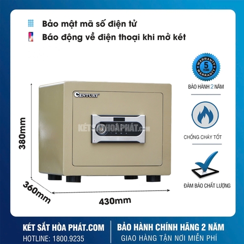 Két sắt thông minh điện tử Century là một trong những hãng Két sắt thông minh tiên tiến và đẳng cấp nhất hiện nay. Với công nghệ Thép đúc nguyên khối, dùng tia Lase cắt 1 mặt thân để làm cánh cửa. Két sắt thông minh có đầy đủ những tính năng an toàn tuyệt đối như: chống cạy phá, chịu được nhiệt độ cao. Đặc biết là không bị bung mối hàn như một số dòng Két sắt thông minh dùng công nghệ hàn nối khác.