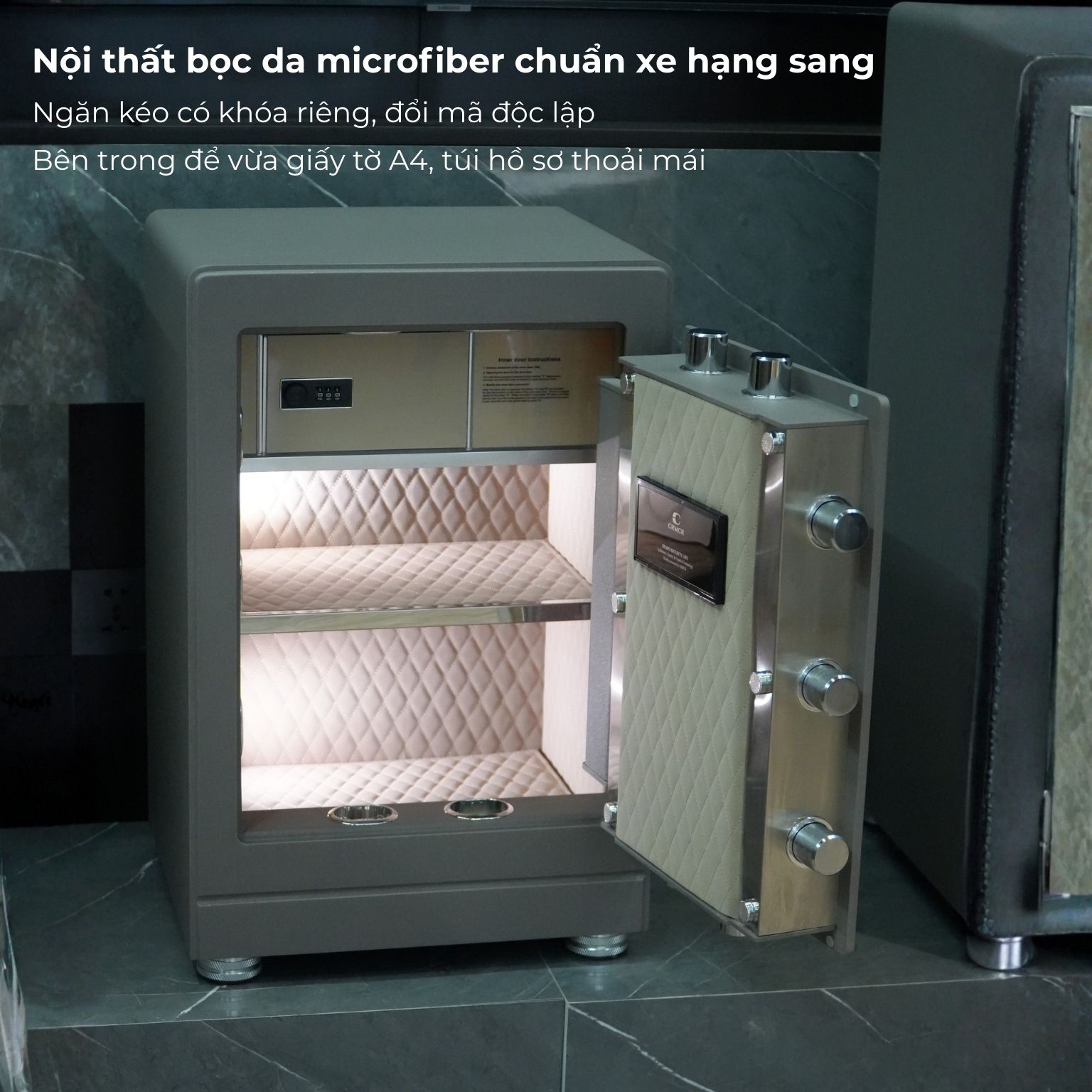 Bố trí bên trong gồm: hai ngăn lớn đựng tiền mặt, hồ sơ, giấy tờ và sổ đỏ; một ngăn kéo phụ có khóa riêng dùng mã số độc lập (cài đặt từ 000–999) để phân quyền hoặc cất giữ tài sản quan trọng; cùng một ngăn hầm bí mật có khóa riêng, là không gian an toàn tuyệt đối để cất vàng và tài sản giá trị cao.