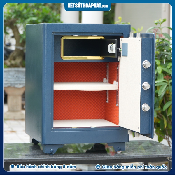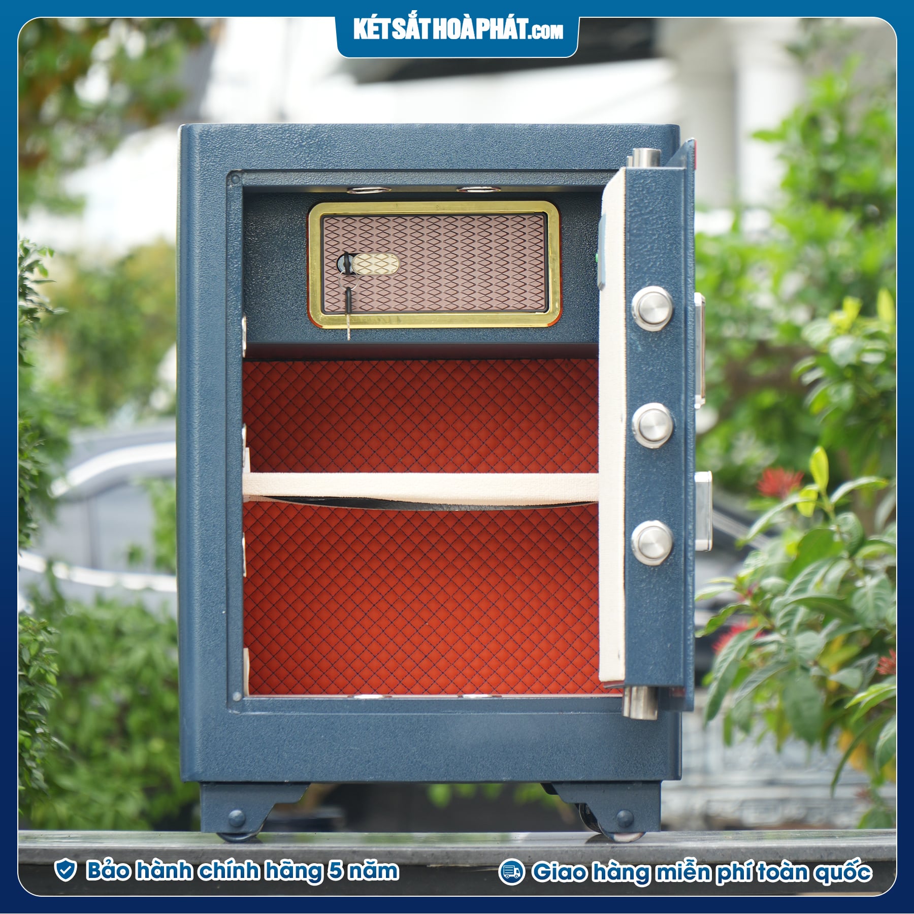 Ngoài ra, két còn được trang bị ngăn kéo có khóa mã riêng biệt, giúp người dùng có thêm một khu vực cất giữ bí mật và an toàn hơn. Kệ đợt bên trong được thiết kế linh hoạt, có thể tháo rời hoặc điều chỉnh để phù hợp với kích thước của từng loại vật dụng, từ giấy tờ A4 cho đến hộp nữ trang hoặc túi hồ sơ.