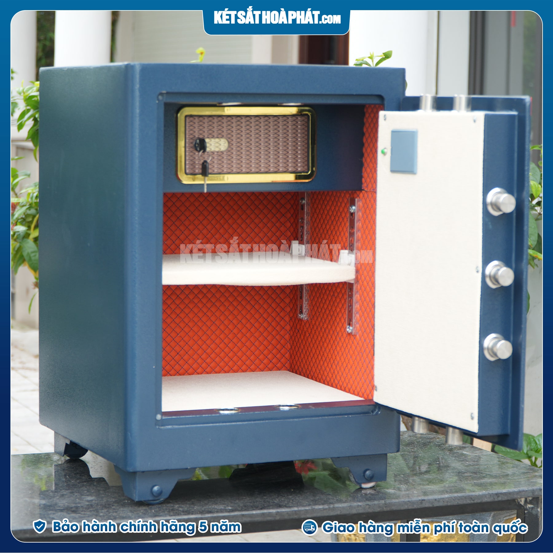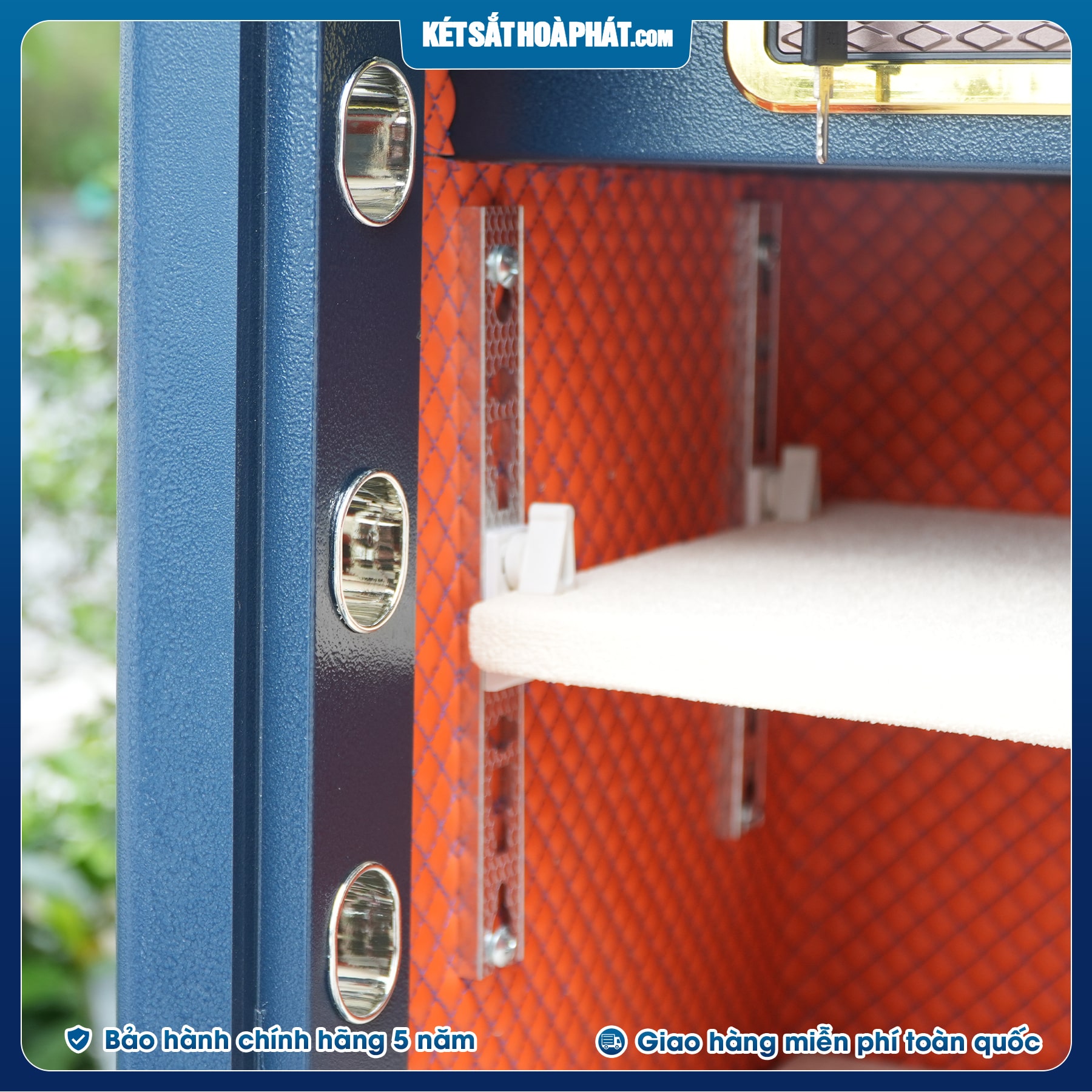 Bên trong két được bố trí kệ đợt tháo lắp linh hoạt, cho phép người dùng thay đổi bố cục tùy theo kích thước tài sản lưu trữ. Có thể tháo rời hoàn toàn để chứa hộp lớn, hoặc chia ngăn gọn gàng khi cất giữ hồ sơ A4, giấy tờ cá nhân, phụ kiện điện tử,…