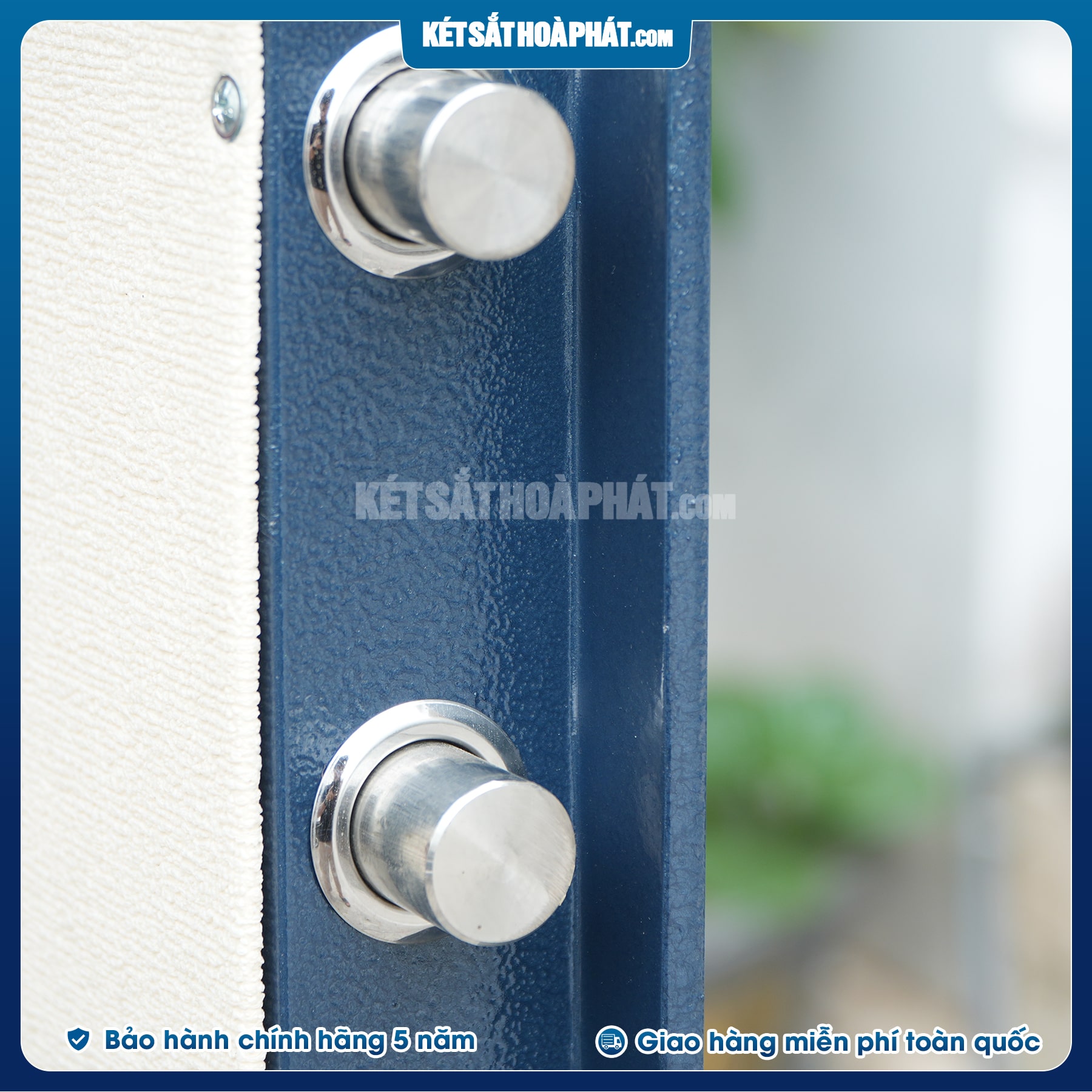 Hệ thống chốt khóa sử dụng chốt thép tròn phi 25 đúc đặc, ăn sâu vào thành két, tạo ra một lớp chắn vững chắc trước các hành vi cạy mở bằng dụng cụ như máy khoan, xà beng, hay búa phá két. Bản lề được thiết kế âm chìm bên trong thân két, giúp tăng tính liền khối và loại bỏ hoàn toàn điểm yếu vốn có ở các dòng két lộ bản lề thông thường.