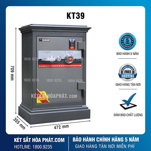 Két sắt tài lộc Hòa Phát KT39 một sản phẩm của két sắt Hòa Phát có thương hiệu nổi tiếng nhất trên thị trường Việt Nam, không chỉ bảo vệ tài sản - Thần giữ của cho mọi nhà mà còn có ý nghĩa phong thủy với ý nghĩa mang tiền tài, may mắn cho gia chủ. KT39 là dòng két sắt khóa cơ có thể đổi mật mã theo ý muốn, có kết cấu chắc chắn chống khoan cắt, chống cháy hiệu quả đạt chuẩn. Sản phẩm cho mọi gia đình, doanh nghiệp, cửa hàng.