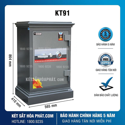 KT91 có kích thước Cao 864, rộng 565, sâu 410, mm là két sắt cỡ lớn với thể tích chứa rộng rãi, có 1 đợt cố định, 1 đợt di động và 1 ngăn kéo với chìa khóa riêng có thể lưu trữ nhiều tài sản, thiết bị có giá trị. 2 bản lề nổi, 8 chốt khóa chìm ăn sâu vào lòng két chắc chắn chống khoan cắt, đục phá hiệu quả. Toàn bộ két được thiết kế nguyên tấm với 3 lớp: 2 lớp thép dày được sơn tĩnh điện chống han gỉ bền bỉ với thời gian, ở giữa có hỗn hợp chống cháy, chịu nhiệt đạt chuẩn bảo vệ tốt nhất tài sản bên trong ngay cả khi có hỏa hoạn xảy ra.