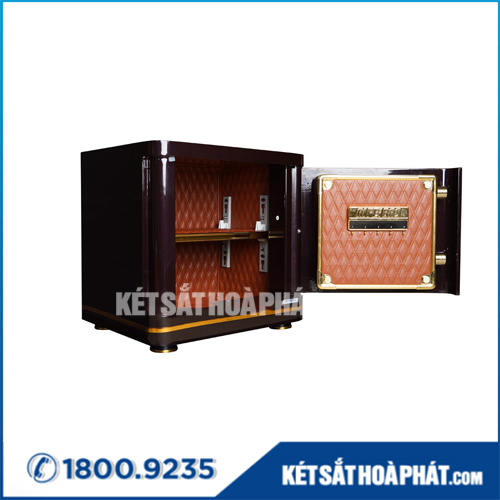 - Nội thất bên trong két: bọc da PU trần quả trám vô cùng thẩm mỹ. Gồm có 1 đợt cố định, 1 đợt di động, cánh cửa có thêm móc treo