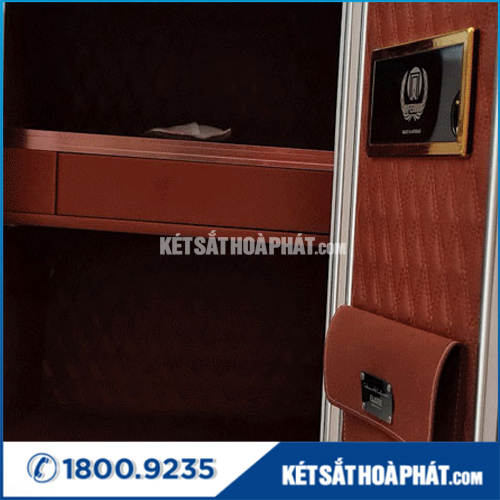 - Nội thất bên trong két: bọc da PU trần quả trám vô cùng thẩm mỹ. Gồm có 2 đợt cố định, có ngăn kéo, cánh cửa có thêm 1 túi da
