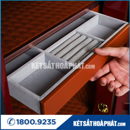 - Nội thất bên trong két: bọc da PU trần quả trám vô cùng thẩm mỹ. Gồm có 1 đợt cố định chia 3 ngăn, có 1 ngăn kéo, cánh cửa có thêm 1 túi da