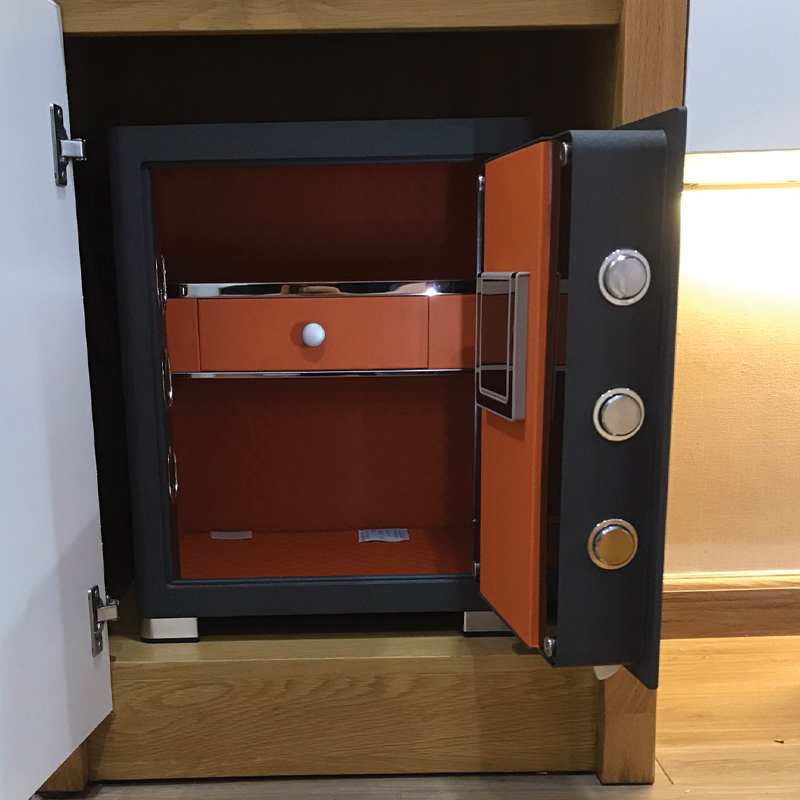 - Nội thất của két sắt thông minh Philips SBX601- 4B0 được bọc lớp da cao cấp màu cam nổi bật. Phối màu tương phản góp phần làm tôn lên vẻ đẹp của chiếc két và tài sản giá trị được cất giữ. Lớp da mềm mại sẽ bảo vệ cho những chiếc đồng hồ cao cấp, trang sức đắt tiền không trầy xước, móp méo. Không gian bên trong két được chia làm 2 ngăn, cùng 1 ngăn kéo đựng đồng hồ trang sức giúp gia chủ sắp xếp tài sản, giấy tờ, tài liệu khoa học và tiết kiệm tối đa diện tích.