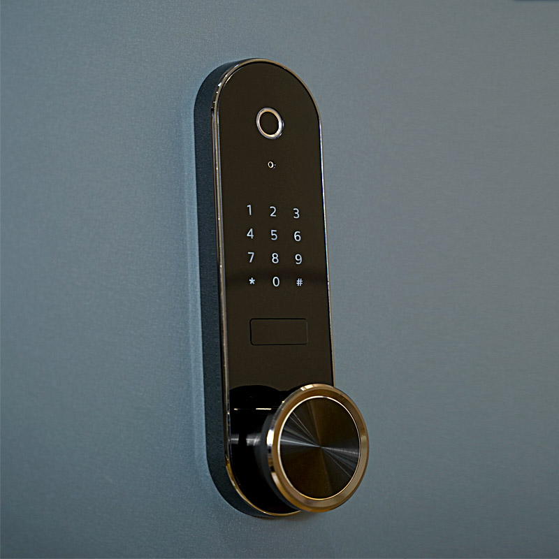 - Bảng điều khiển màu đen nổi bật trên lớp sơn xám xanh, lớp kính cường lực bóng bẩy chống va đập hiệu quả, bo viền tinh tế và sắc nét càng tôn lên vẻ đẹp thời thượng của chiếc két. Bộ phận nhận diện vân tay và bảng điện tử nhanh nhạy, chính xác.