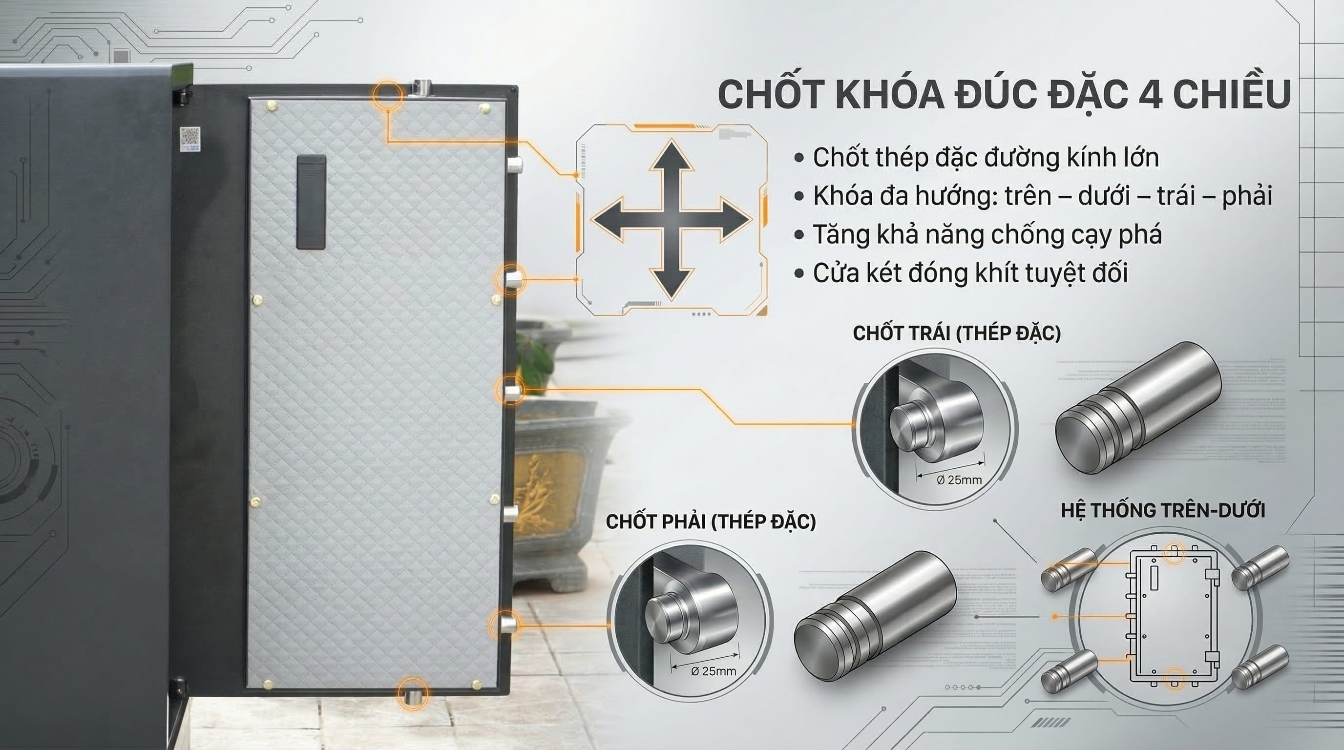 Sáu chốt khóa inox đúc đặc phi 25mm ăn sâu vào ba chiều thân két, hoạt động độc lập từng chốt, tạo nên lớp bảo vệ vững chắc chống nạy, chống khoan và chống phá bằng lực cơ học.