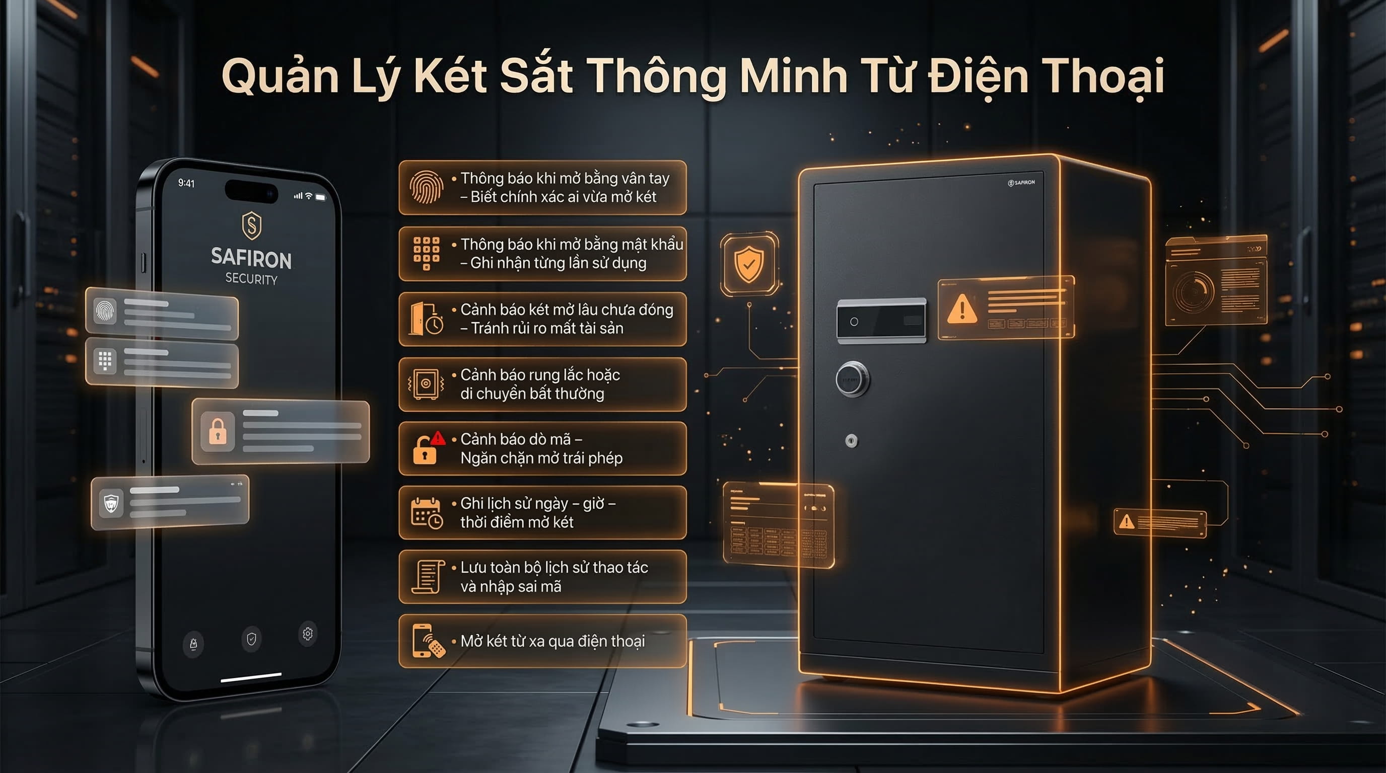 Mở két, xem lịch sử truy cập, nhận cảnh báo khi có rung lắc hoặc tác động lạ. Đây là tính năng quan trọng giúp quản lý két an toàn tuyệt đối dù bạn đang ở xa.