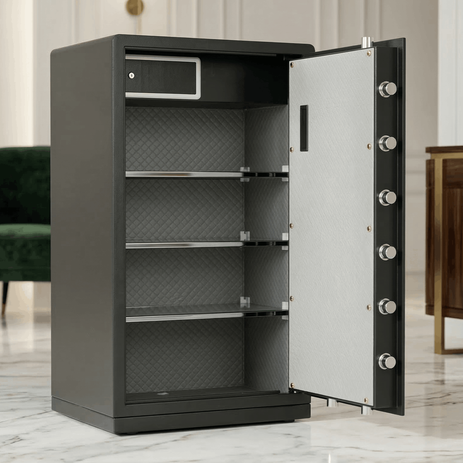 Không gian bên trong được chia thành nhiều tầng khoa học, có ngăn kéo riêng. Lớp nỉ kim cương chống trầy xước, bảo vệ trang sức – hồ sơ – vàng bạc và tăng sự sang trọng mỗi lần mở két.