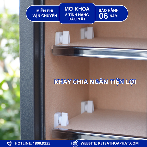 Trang bị hai khay đựng có thể tháo lắp linh hoạt, cho phép sắp xếp tài sản theo tầng – tối ưu không gian cho vàng, trang sức, giấy tờ hoặc thiết bị điện tử.