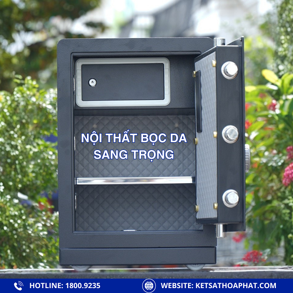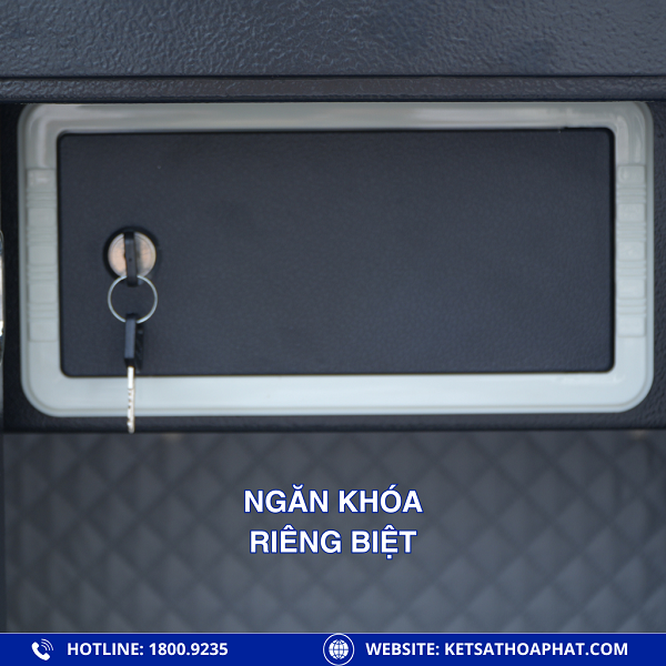 Bên trong két được chia 3 ngăn rộng rãi, có 1 ngăn khóa riêng biệt giúp cất giữ giấy tờ quan trọng, sổ đỏ, vàng bạc hoặc tiền mặt.