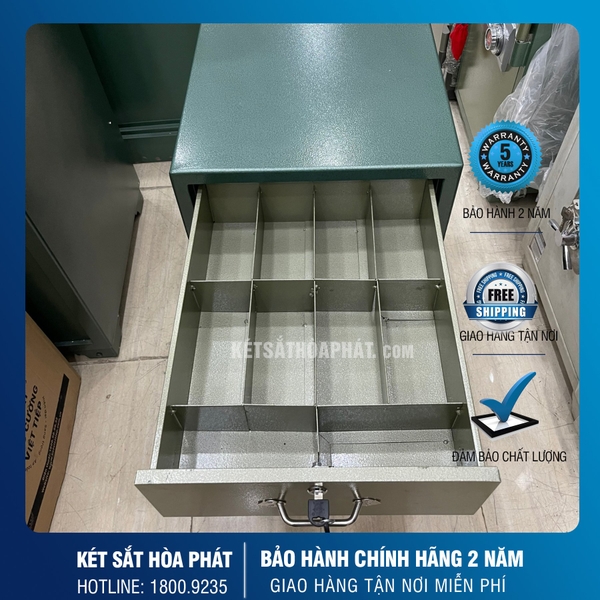 két sắt ngân hàng 2 tầng bên trong phía trên cho nhiều khay chìa thày các ô đựng tiền khác nhau