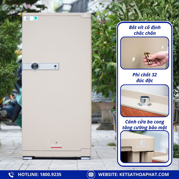 Cửa két dày 8mm, tích hợp 5 chốt khóa đặc phi 32mm ăn sâu 3.8cm vào thân két, kết hợp hèm khóa khép kín bốn cạnh giúp tăng độ an toàn tối đa.