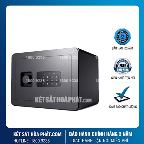 Thiết kế thẩm mỹ: Két hình hộp dáng nằm nhỏ gọn, bo viền góc tinh tế, mềm mại, bên ngoài được sơn tĩnh điện màu đen toàn bộ chống han gỉ, bong tróc, bền bỉ với thời gian. Bên trong có 1 đợt cố định chia 2 ngăn thuận tiện cho việc bố trí, sắp xếp tài sản, đồ đạc. Bảng khóa là bàn phím số, có đèn led, tay nắm tròn đẹp mắt