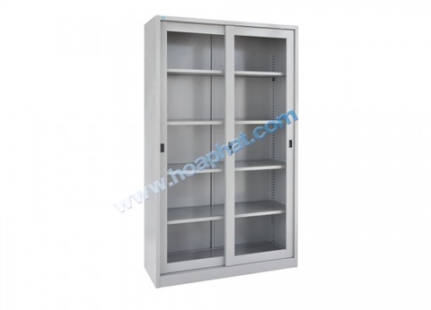 Tủ gồm 1 khoang, cánh kính lùa khung thép, có 4 đợt di động